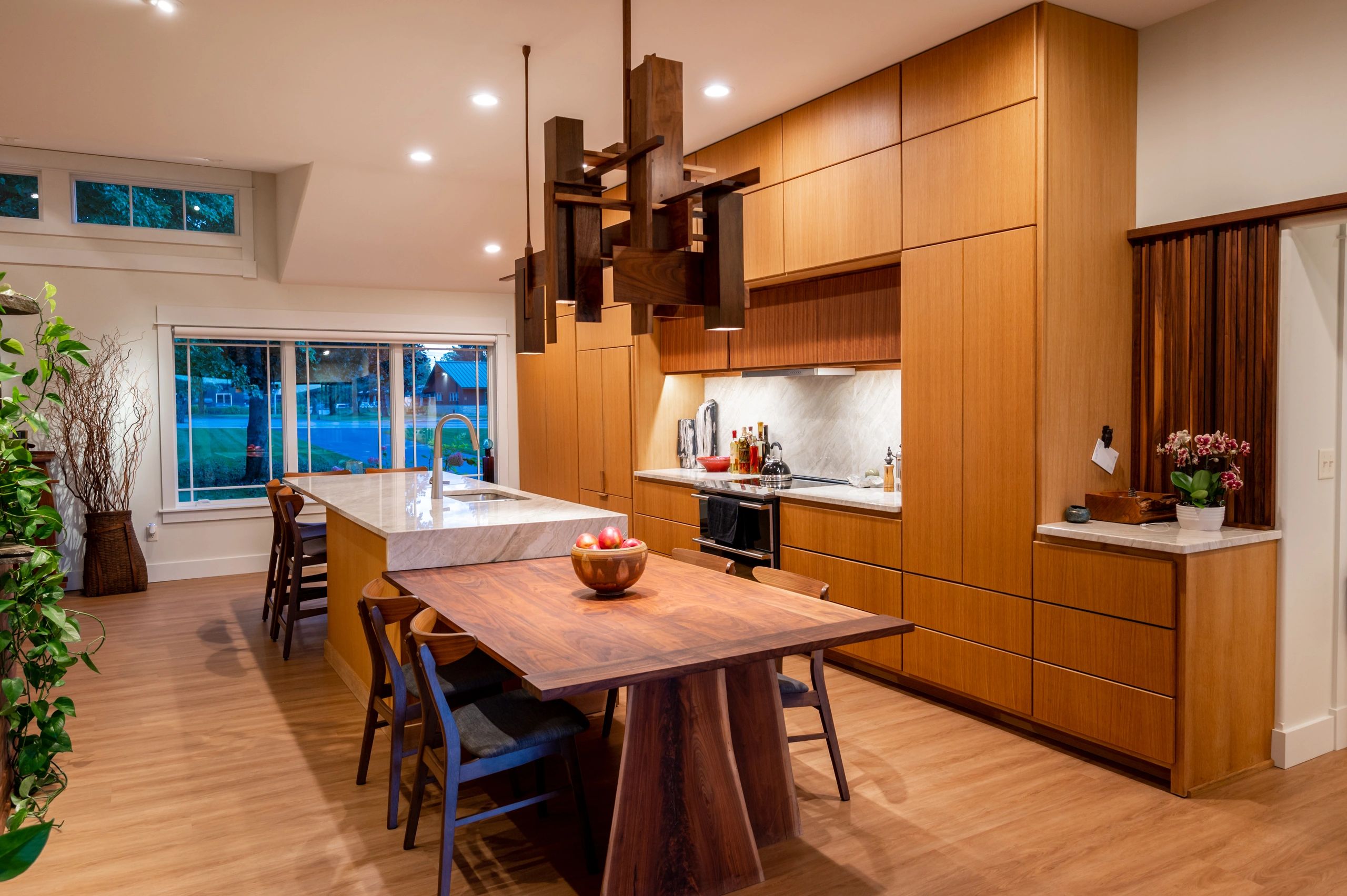 Flat Panel Custom Oak Cabinets, Walnut Light Fixture & Table