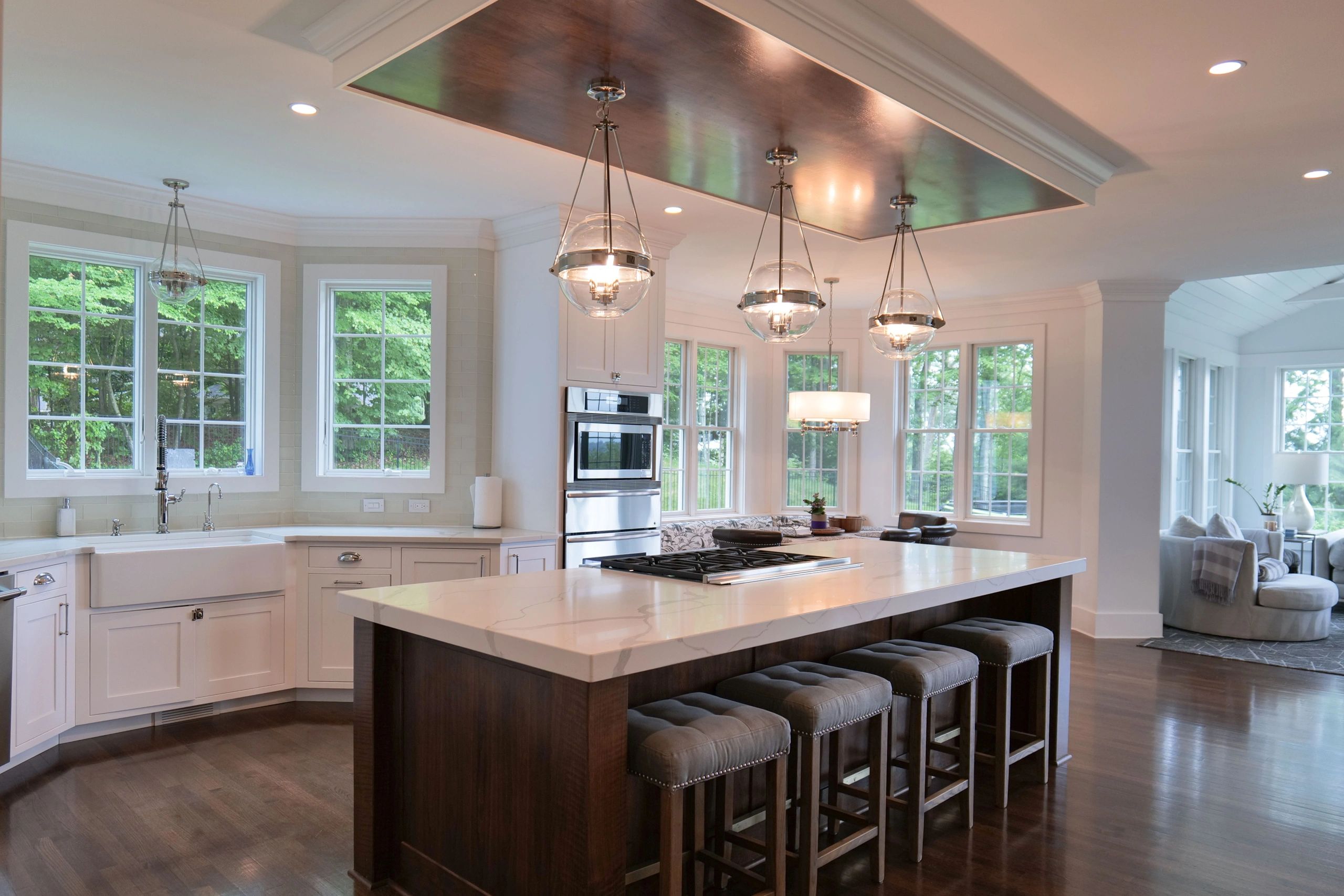 White Custom Cabinets, Walnut Tray Ceiling & Island