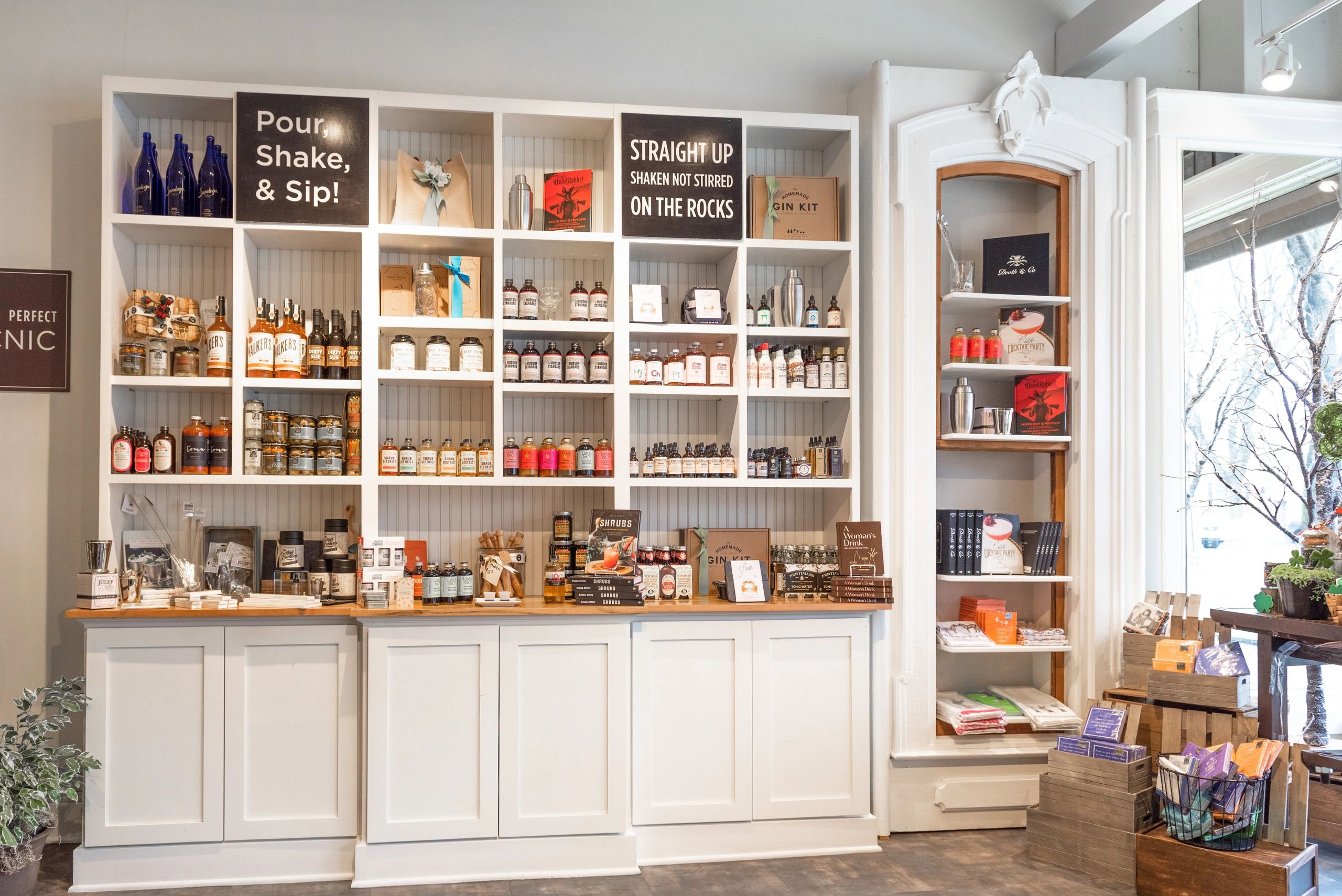 White Shelving & Cabinets, wainscot back and oak top.